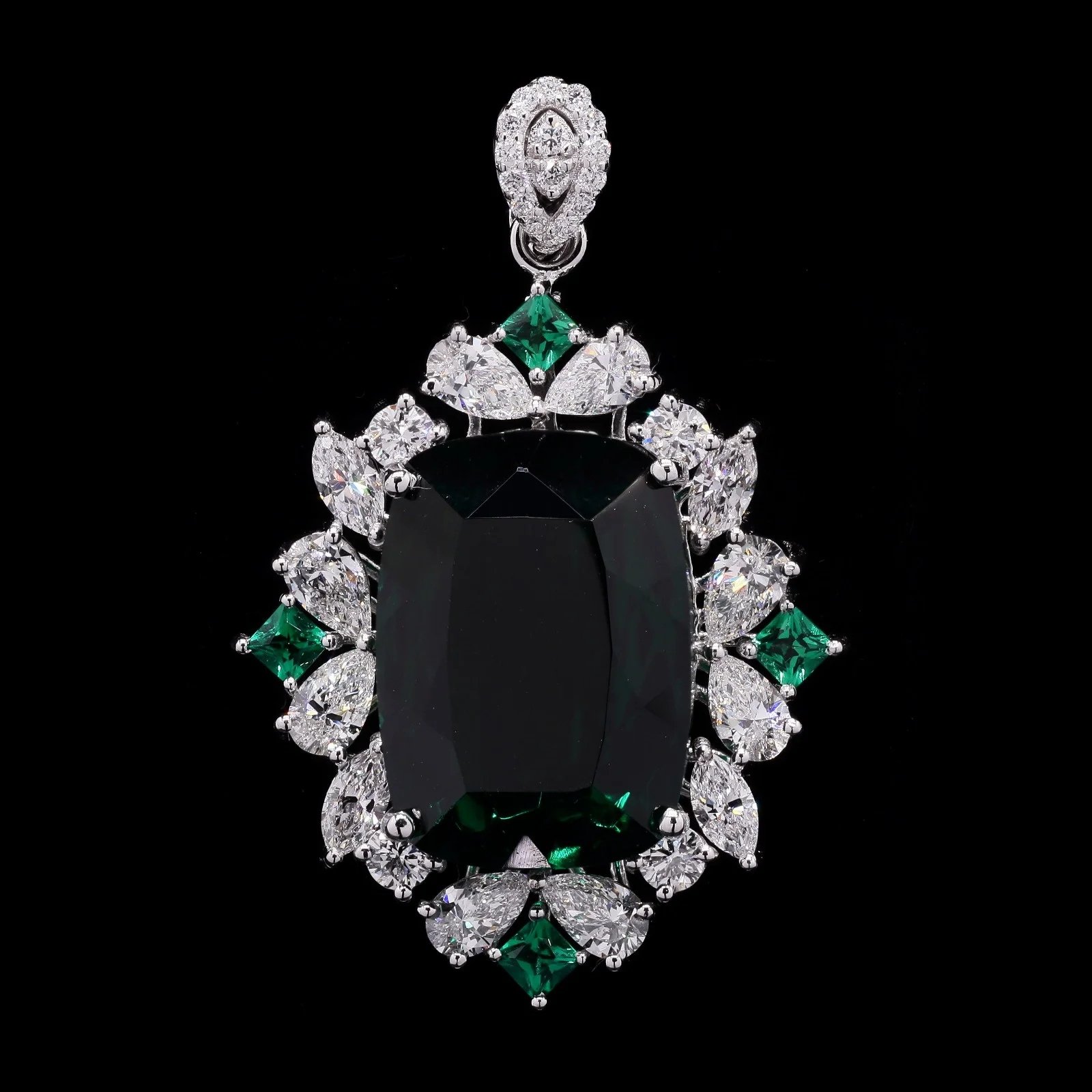This exquisite emerald pendant is a celebration of vibrant color and intricate craftsmanship. At its center, a lush, vivid emerald captivates with its rich green hue, while an array of fancy-shaped diamonds—featuring cuts such as marquise, pear, and baguette—gracefully surround and accentuate the pendant’s design. Each diamond is carefully set to enhance sparkle and add dimension, creating a harmonious blend of color and brilliance. Perfect for adding a touch of sophisticated glamour to any ensemble, this pendant is a timeless treasure.
